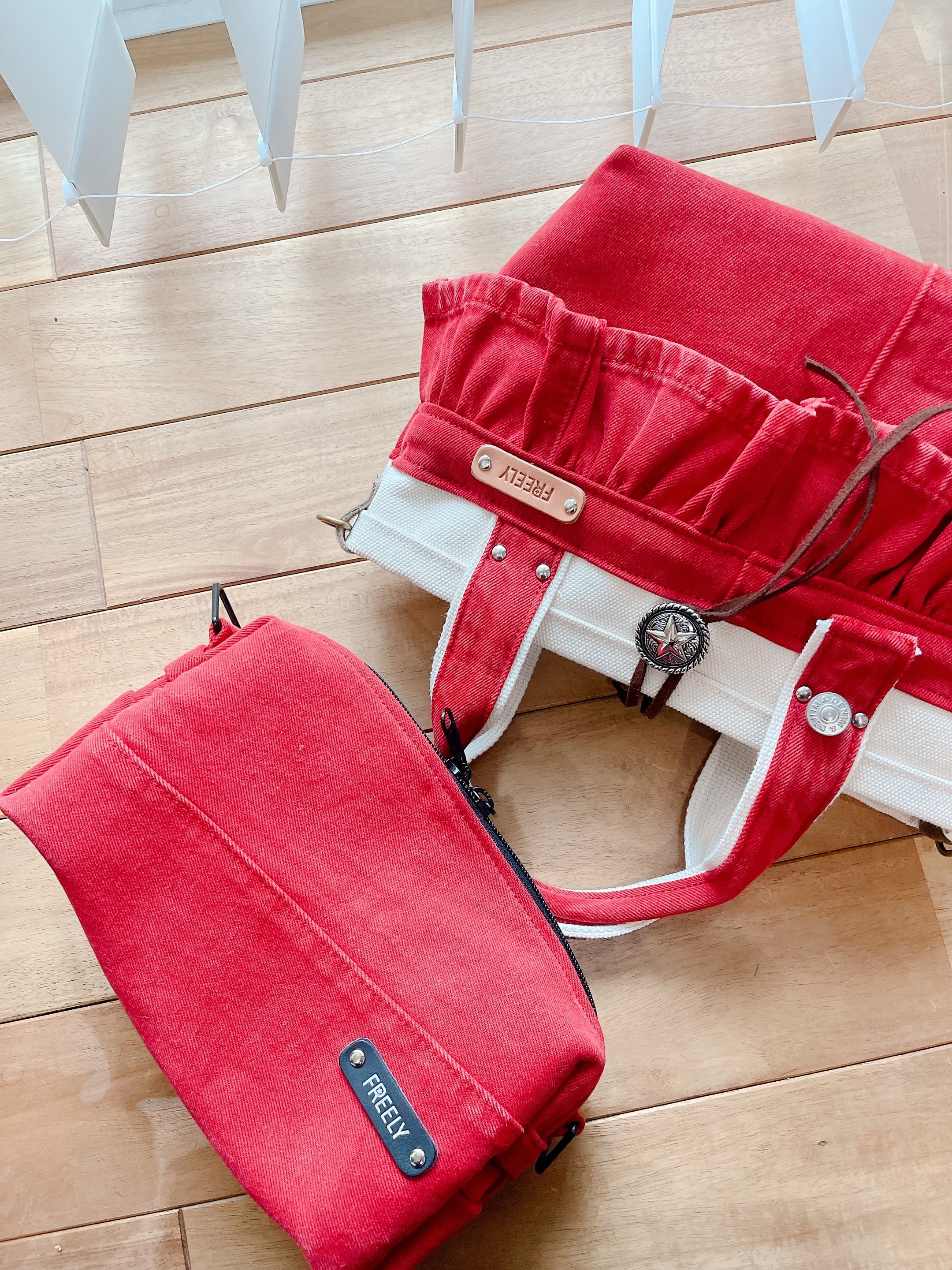 特別なイベントでも活躍すること間違いなし!赤フリルトートスクエアセットを手に入れて、大人可愛いスタイルを楽しんでください。
