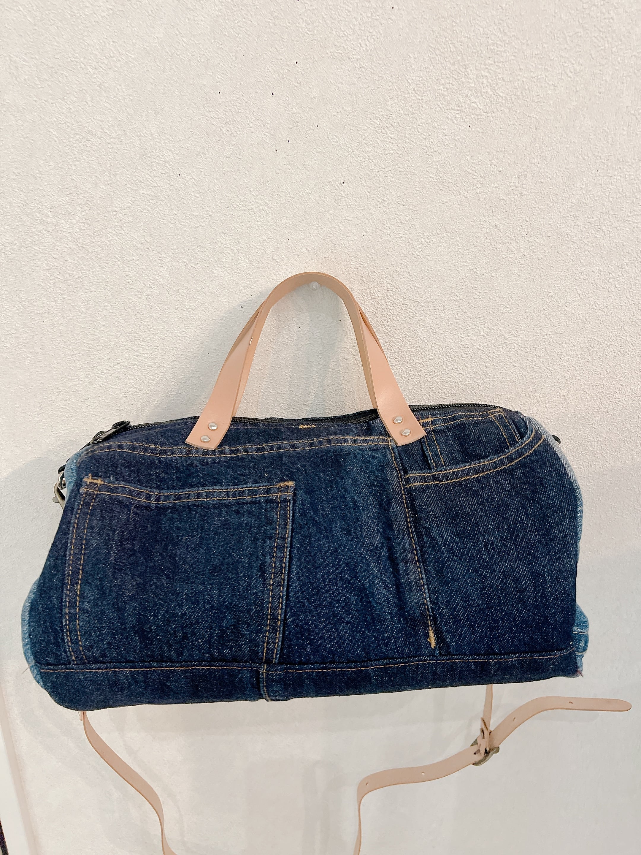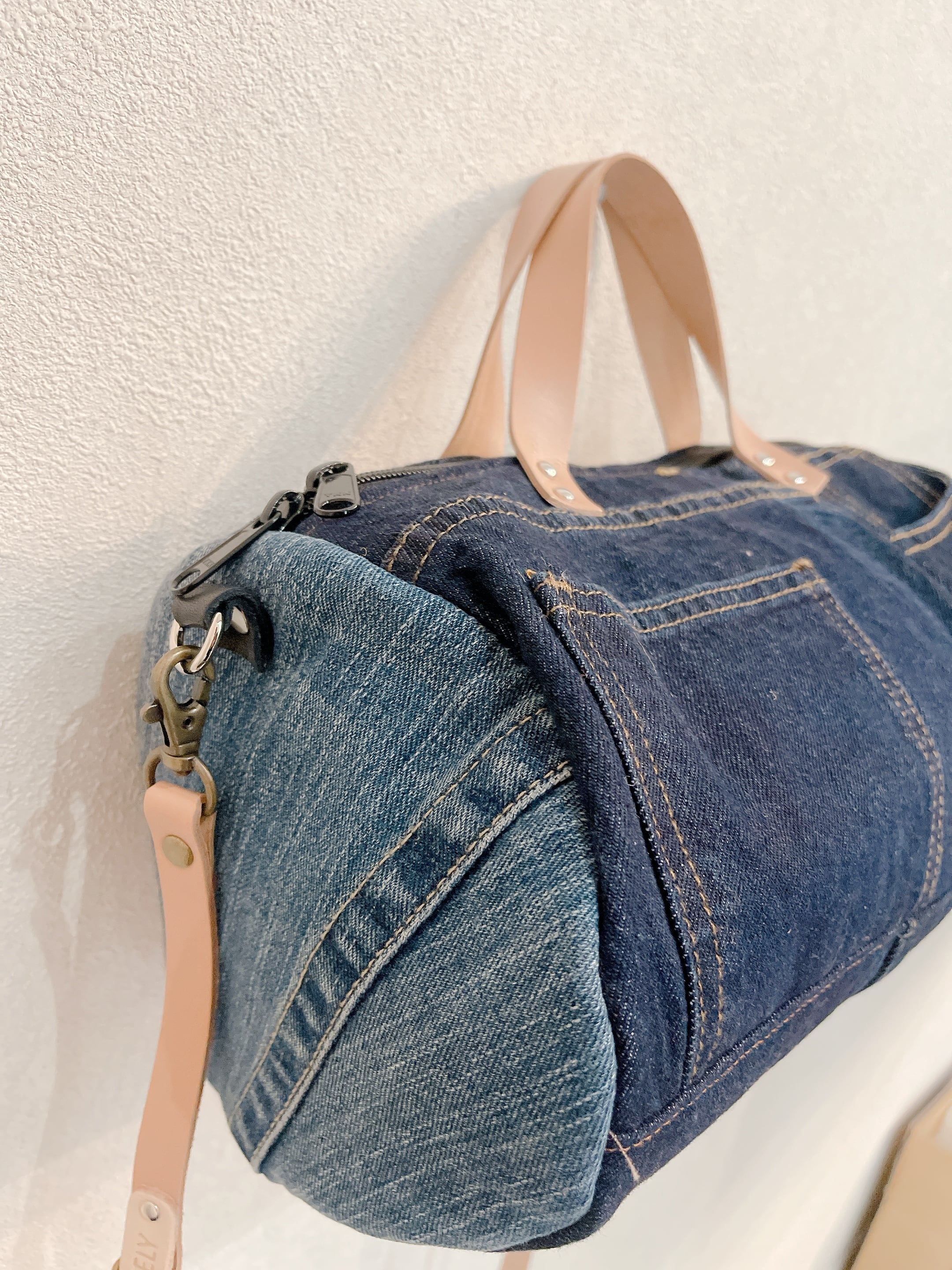 本革の持ち手とショルダーがデニムとの相性がよく